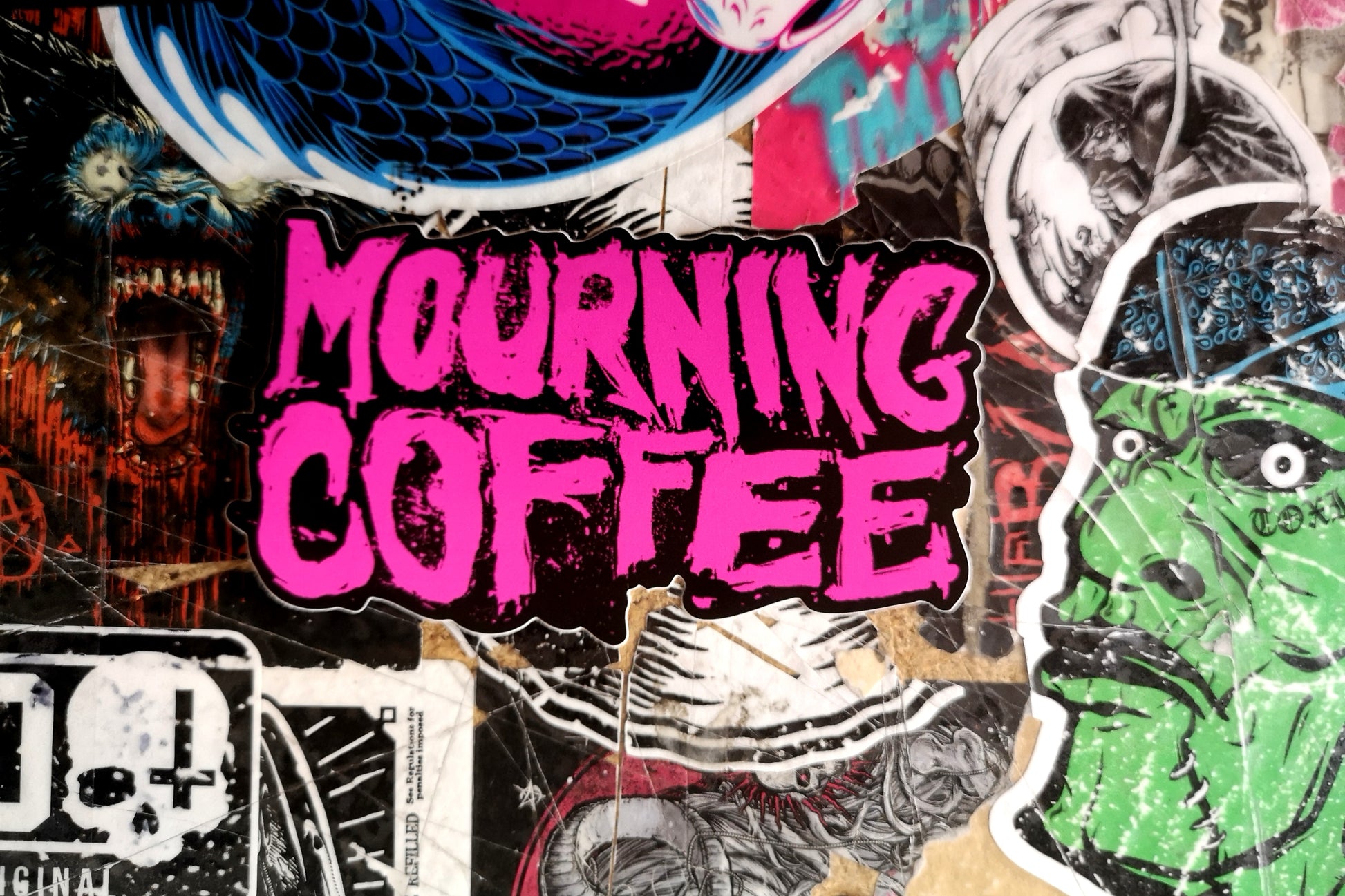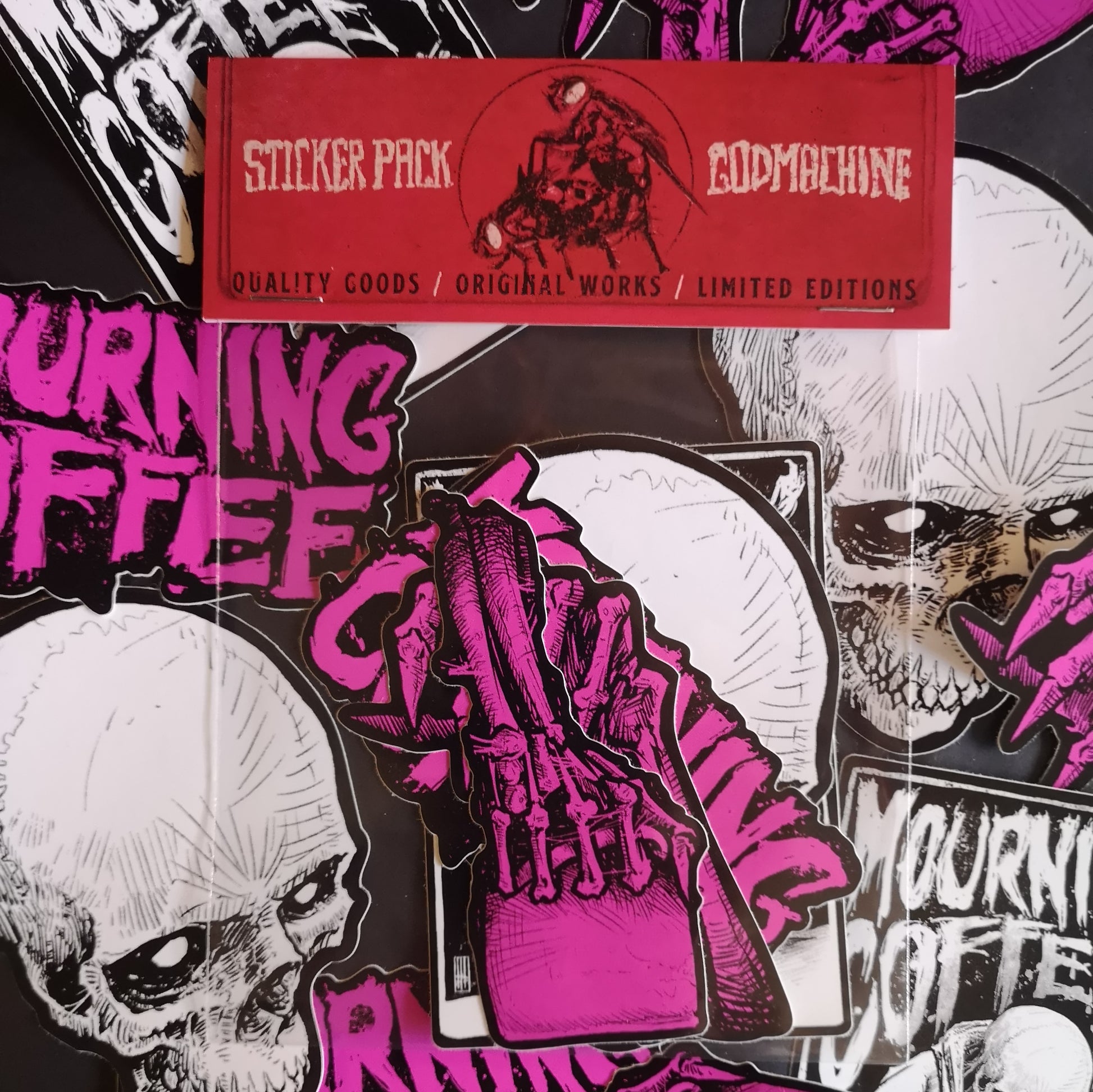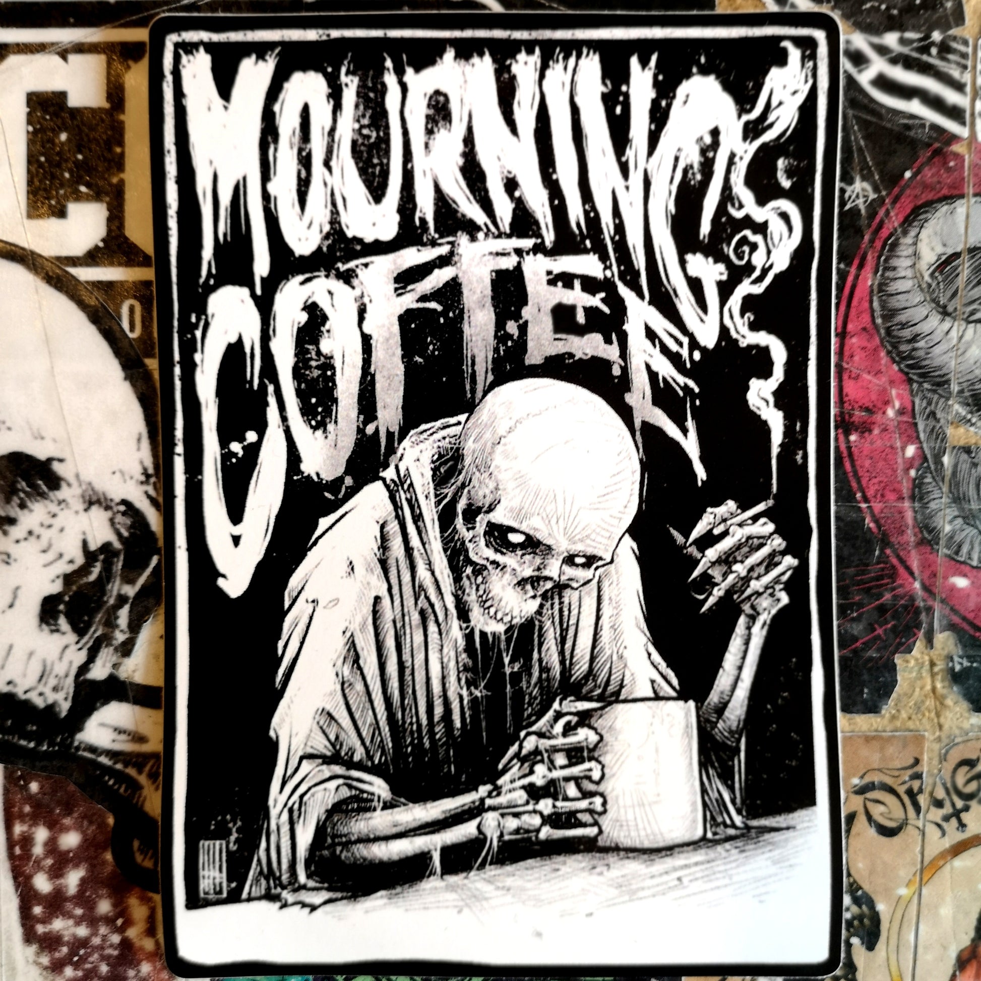 A pack of 5 vinyl die-cut stickers featuring elements from GMs Mourning Coffee design