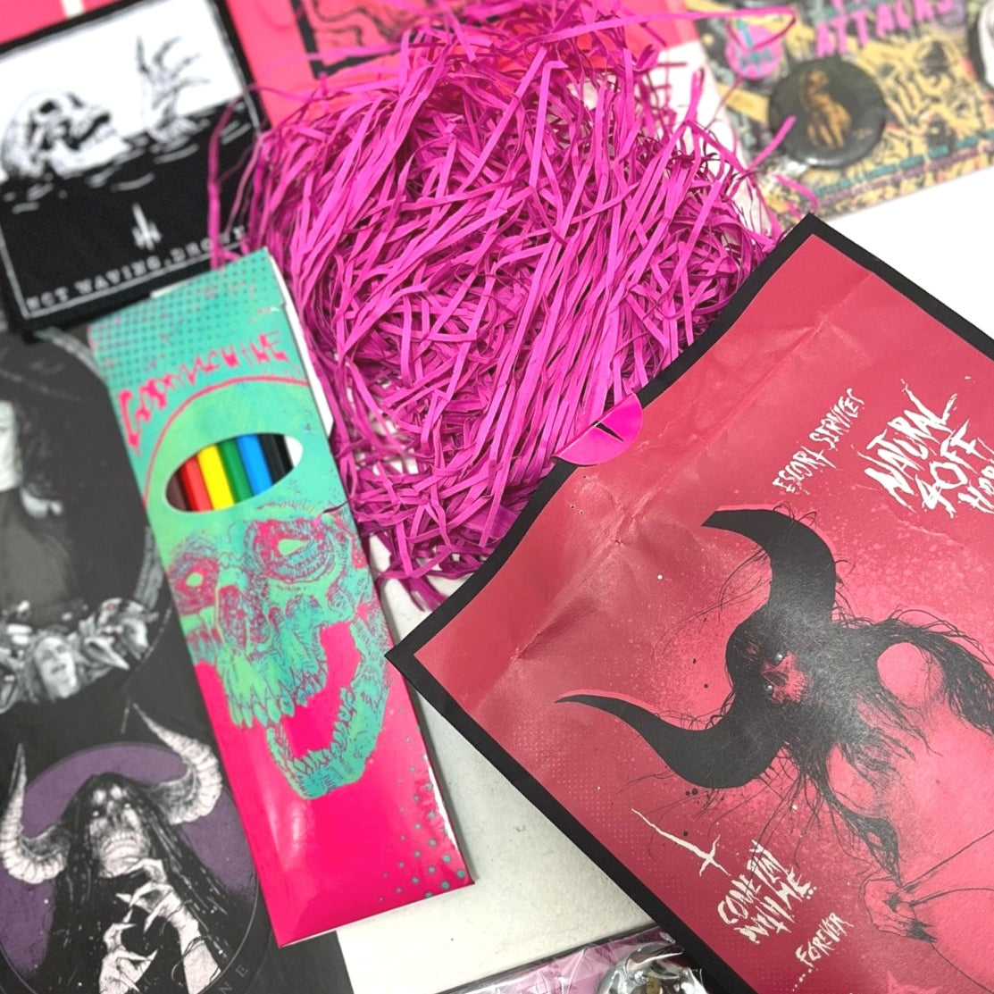 Holding two sets of 4 pin badges, one gold enamel pin, a set of exclusive Godmachine BIC ® colouring pencils and a 100mm woven patch.