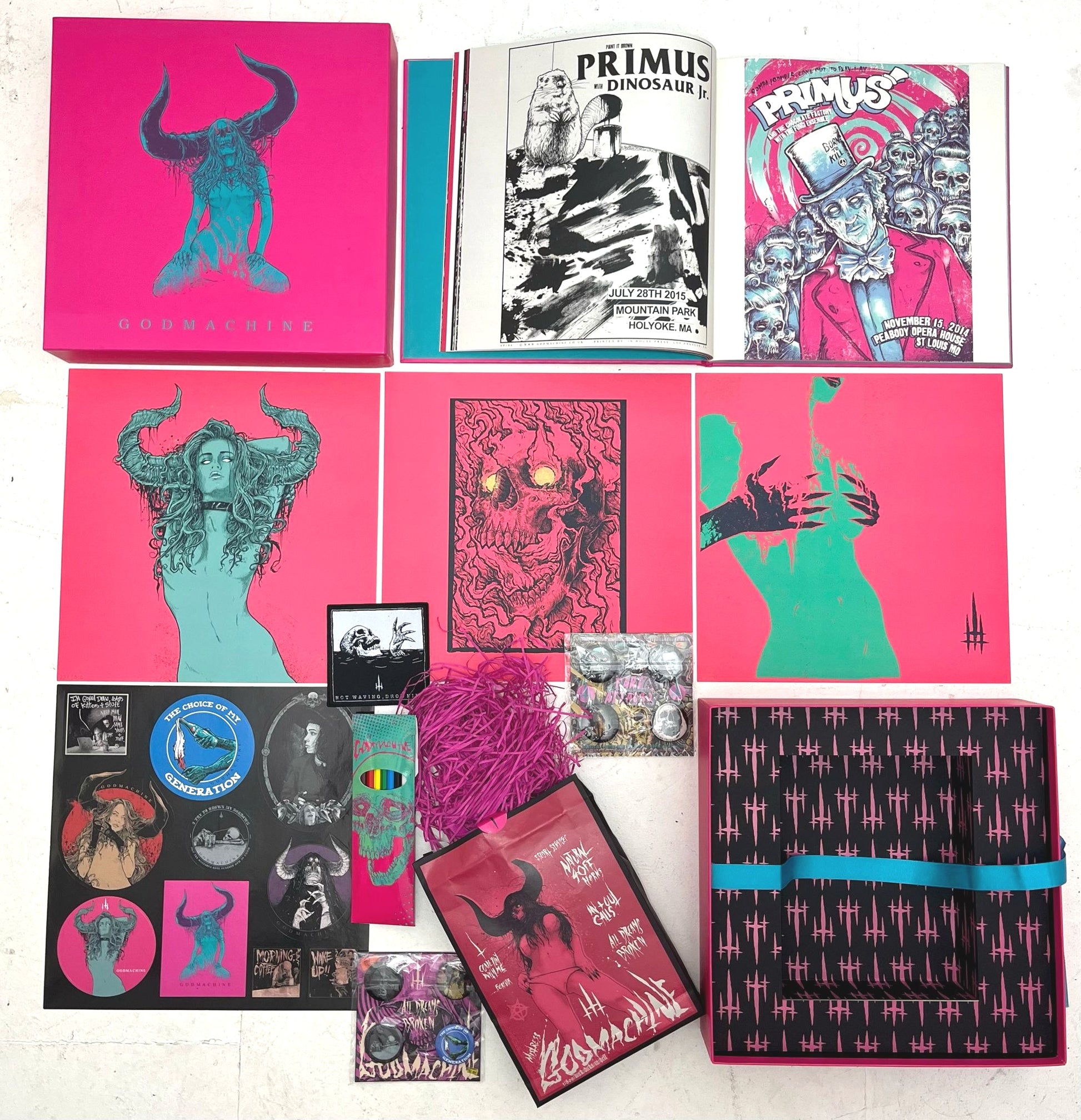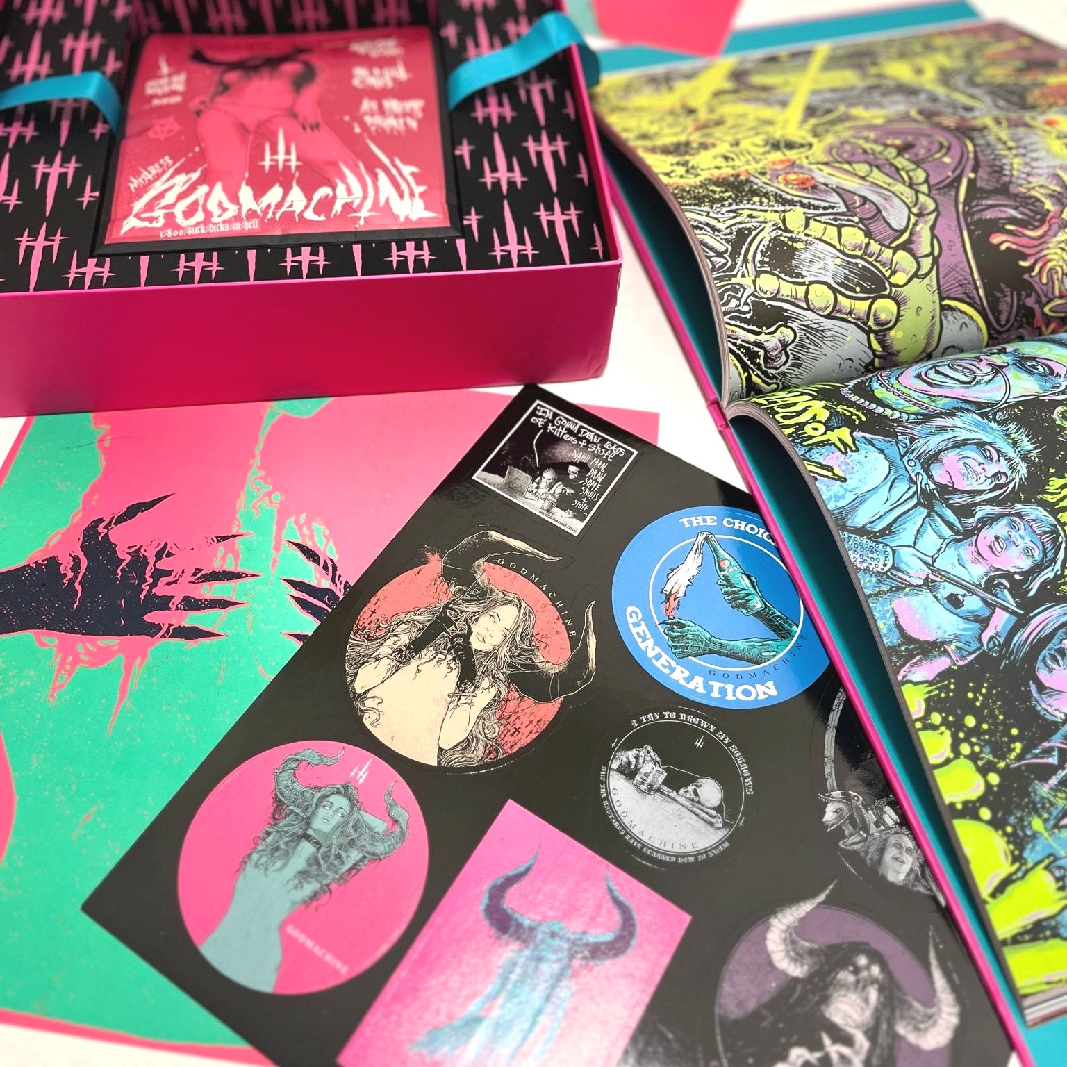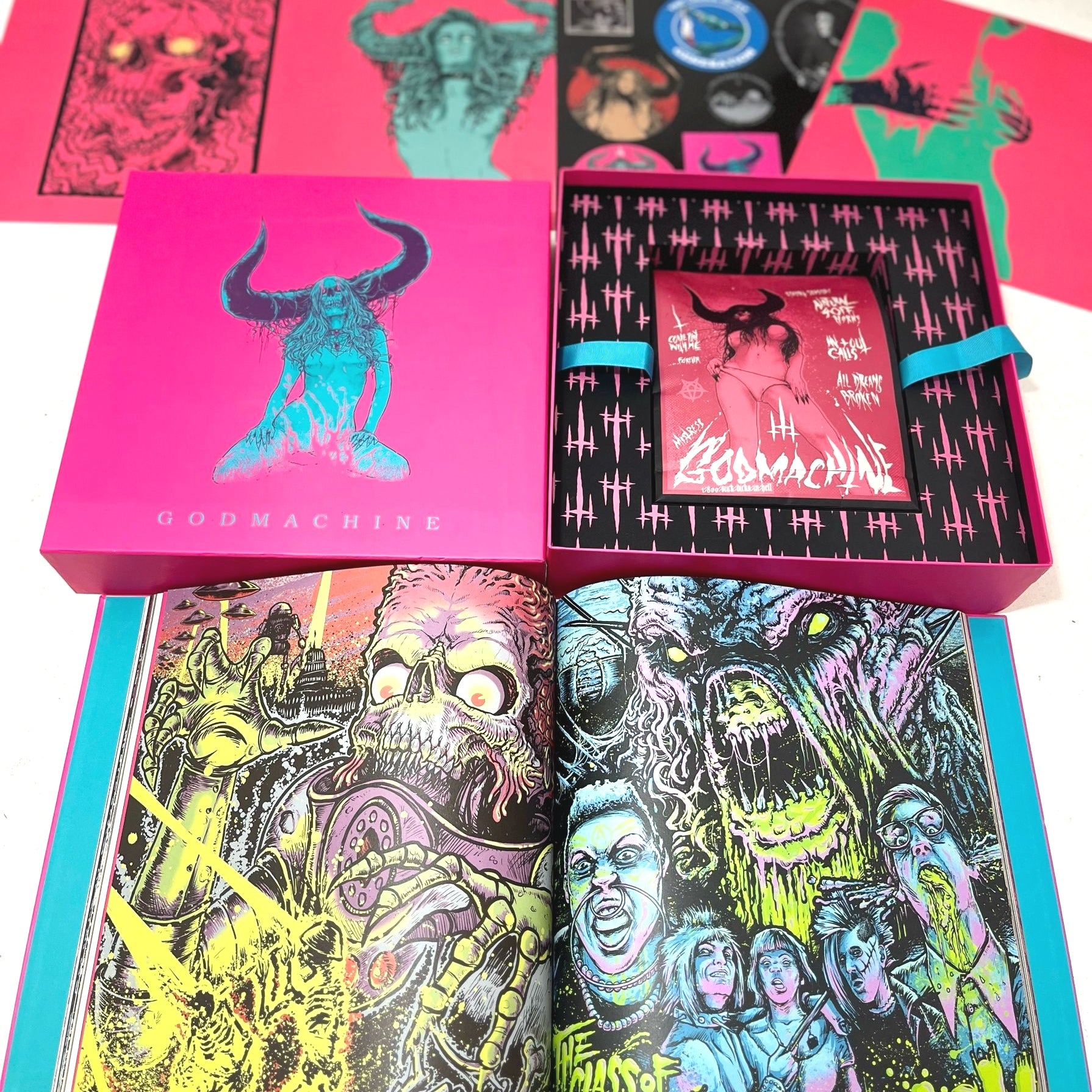 This incredible, super packed box set comes with tons of extras and is limited to just 400 copies worldwide. Housed in a 12” HOT PINK lift off lid box with internal foiling- This limited edition 48 page Hardback book picks up where 'The Art of Godmachine' left off