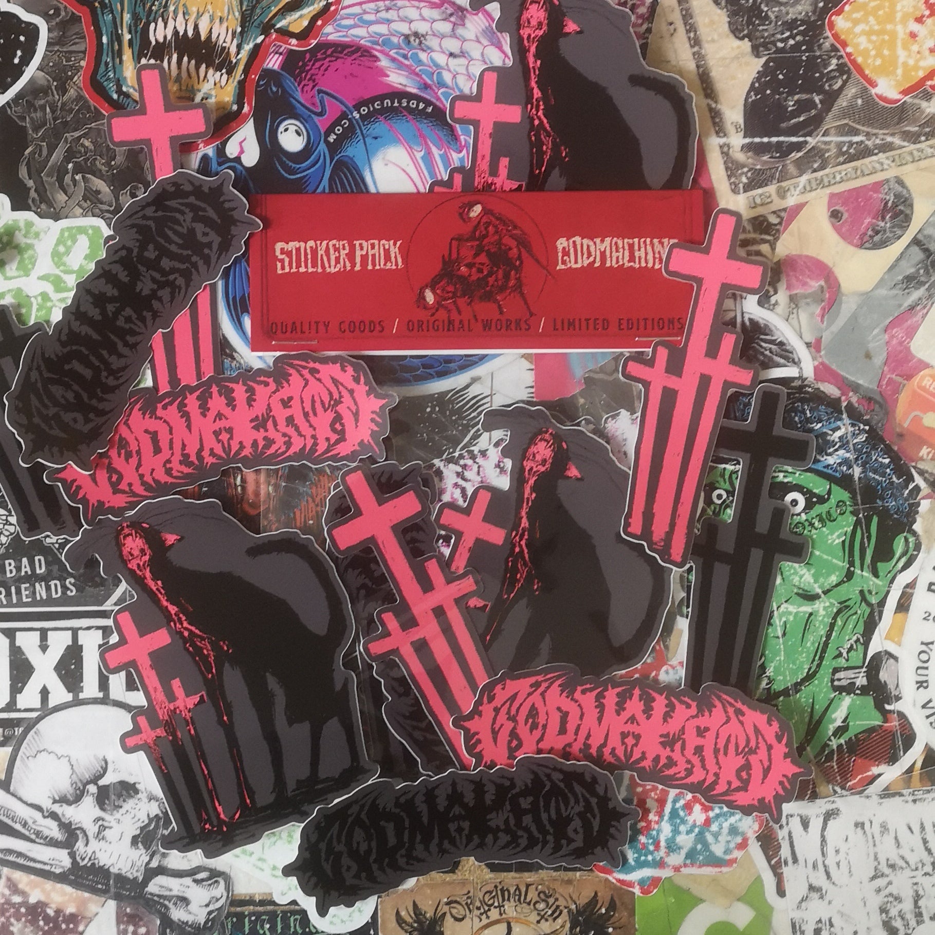 A pack of 5 vinyl die-cut stickers featuring elements from GMs El Gato design